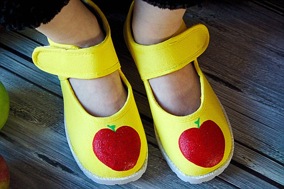 Snow White Apple Shoes - Fully Hand painted red apples on yellow  maryjane shoe for girls - baby or toddler  Disney Shoes Snow white Disney Dwarf Doc painting - figure on green and yellow canvas.  Unique wall decoration.